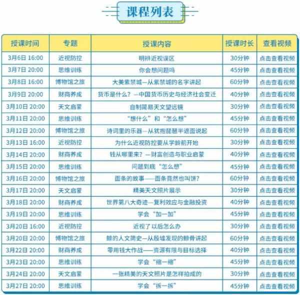 教师网密切关注疫情之下师*的身心健康,开发了专门的疫情防护课程,更了解基于特殊时期,家长与孩子的接触陡然增加,二者如何共同学习、并肩成长这一摆在家长面前的难题。为此,我们组建了一支家庭教育特别行动队,开设了亲子营·家庭教育系列课程,第一期特别推出“视力防控”“思维训练”“博物馆游学”“财商养成”“天文启蒙”五个系列,分享家庭教育心得,助力家庭教育水平提升。