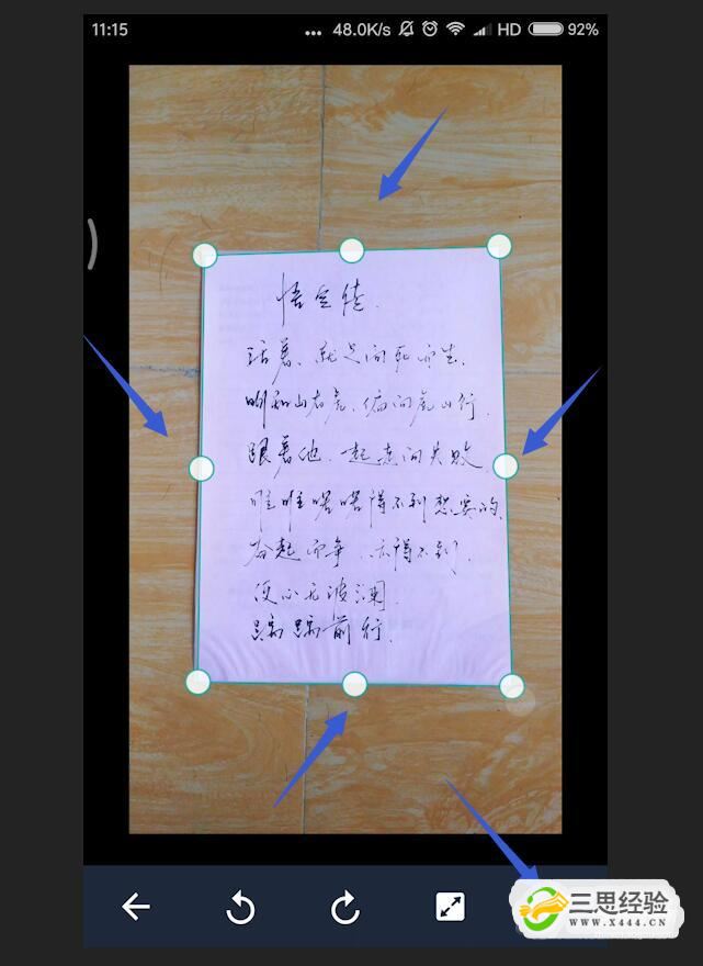 剪切照片在照片加载到全能扫描王中时,会进行一些简单的扫描处理,但有的时候细节处理得不够好,我们点击照片进行剪切,剪切完成后点击右侧的小对号。