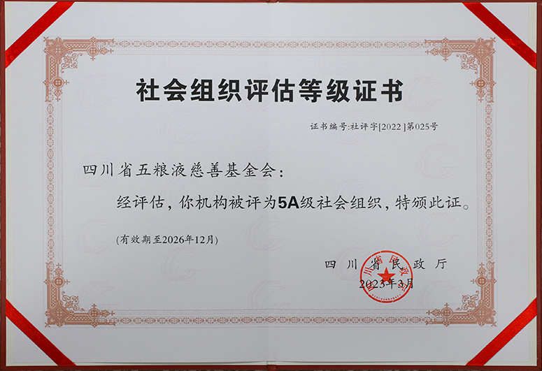 2022年四川省民政厅对全省性社会组织开展了等级评估工作。五粮液慈善基金会按照评估标准,从基础条件、内部治理、工作绩效、社会评价等方面对成立以来的工作进行了全面系统的梳理和总结,形成百余套迎评材料。现场评估专家通过查证资料,认为五粮液慈善基金会内部治理完善、财务管理规范、项目实施成效显著、信息公开透明。最终经过等级公示、确认结果等程序,五粮液慈善基金会被评为5A级社会组织。这既是四川省民政厅、评估专家和社会各界对五粮液慈善基金会管理规范、高水平合规运作公益慈善项目工作的肯定和鼓励,也是对五粮液历年践行社会责任的高度认可。