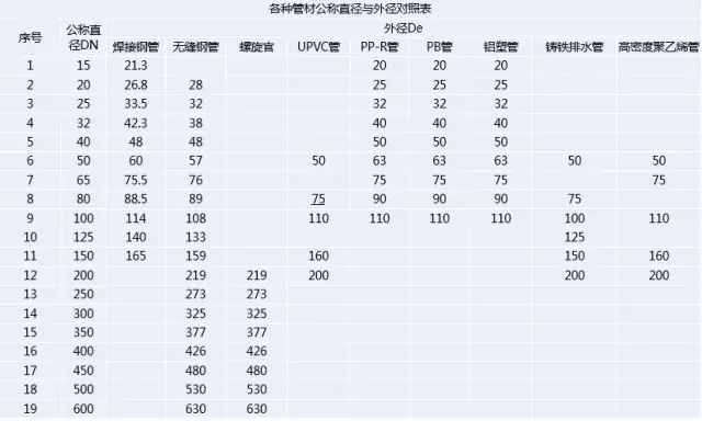 公称直径可用公制mm表示,也可用英制in表示。管路附件也用公称直径表示,意义同有缝管。它与英制单位的对应关系如下: