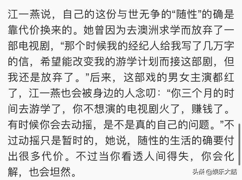 后来,《步步惊心》让刘诗诗走红,江一燕因话剧《七月与安*》重回观众视野,提及红不红的问题,她直言:“我要是想红,早就接拍穿越剧了”。