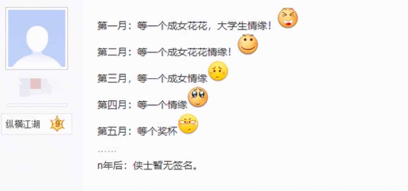 还有原本并不搞笑的签名,随着几次改动硬是把自己变成一个笑话的。像这位老哥,一开始还想找个成女花花情缘,还指定要大学*。一个月之后就不要求对方必须是大学*了,再过一个月,只要是成女就行,哪个门派无所谓,到了最后,体型都不管了,能当情缘就行!后来啊,就没有情缘这个想法了。