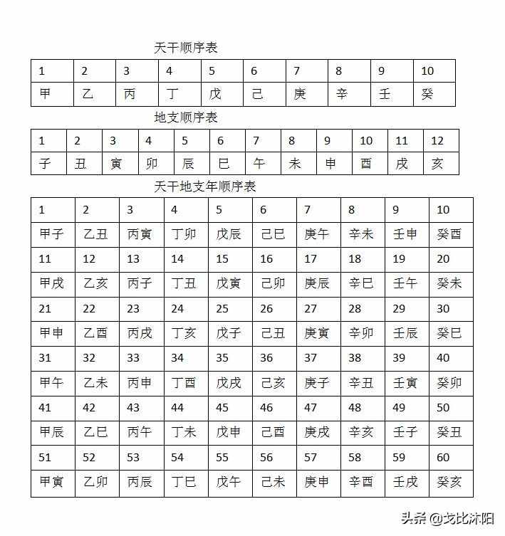 五、天干地支纪年表。按照天干地支纪年的方法,可以列出一个甲子的60年天干地支顺序年表: