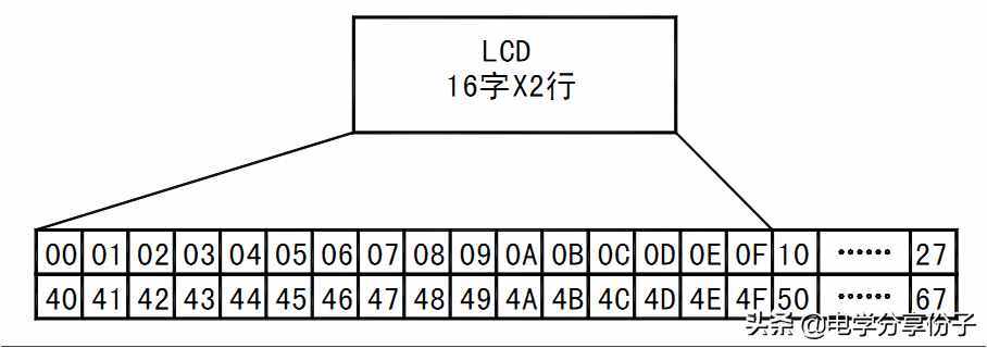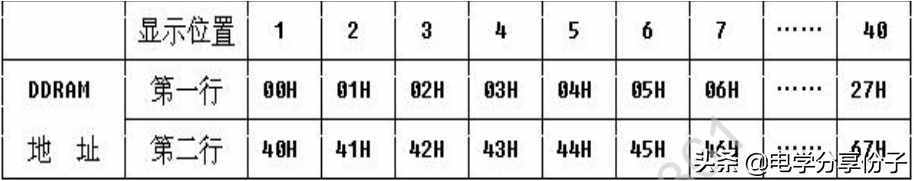 二:在设置完成之后我们就要明白具体是在哪显示,在哪个位置显示?在对液晶模块的初始化中要先设置其显示模式, 在液晶模块显示字符时光标是自动右移的, 无需人工干预。 每次输入指令前都要判断液晶模块是否处于忙的状态。DDRAM 就是显示数据 RAM ,用来寄存待显示的字符代码。共 80 个字节,其地址和屏幕的对应关系如下表: