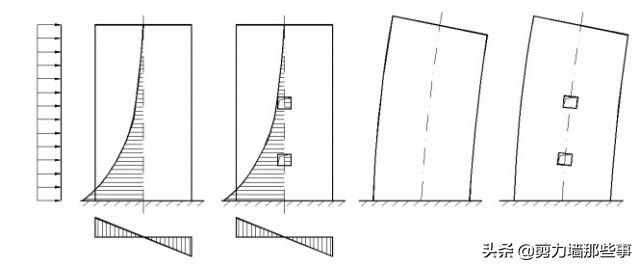 当剪力墙上所开洞口面积稍大且超过墙体面积的15%时,通过洞口的正应力分布已不再成一直线,而是在洞口两侧的部分横截面上,其正应力分布各成一直线。这说明除了整个墙截面产*整体弯矩外,每个墙肢还出现局部弯矩,因为实际正应力分布,相当于在沿整个截面直线分布的应力之上叠加局部弯矩应力。但由于洞口还不很大,局部弯矩不超过水平荷载的悬臂弯矩的15%。因此,可以认为剪力墙截面变形大体上仍符合平面假定,且大部分楼层上墙肢没有反弯点。内力和变形仍按材料力学计算,然后适当修正。 在水平荷载作用下,这类剪力墙截面上的正应力分布略偏离了直线分布的规律,变成了相当于在整体墙弯曲时的直线分布应力之上叠加了墙肢局部弯曲应力,当墙肢中的局部弯矩不超过墙体整体弯矩的15%时,其截面变形仍接近于整体截面剪力墙,这种剪力墙称之为小开口整体剪力墙。