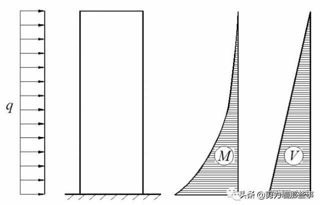 整体墙的内力可按上端自由,下端固定的悬臂构件,用材料力学公式,计算其任意截面的弯矩和剪力。总水平荷载可以按各片剪力墙的等效抗弯刚度分配,然后进行单片剪力墙的计算。 剪力墙的等效抗弯刚度(或叫等效惯性矩)就是将墙的弯曲、剪切和轴向变形之后的顶点位移,按顶点位移相等的原则,折算成一个只考虑弯曲变形的等效竖向悬臂杆的刚度。