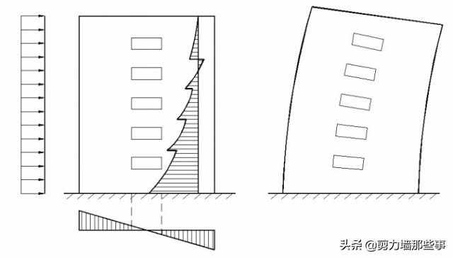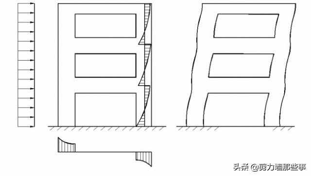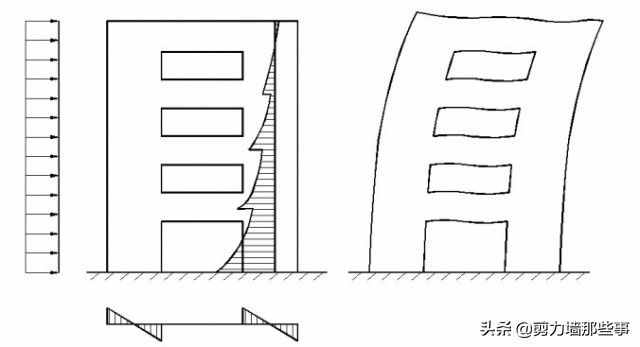 无洞口的剪力墙或剪力墙上开有一定数量的洞口,但洞口的面积不超过墙体面积的15%,且洞口至墙边的净距及洞口之间的净距大于洞孔长边尺寸时,可以忽略洞口对墙体的影响,这种墙体称为整体剪力墙(或称为悬臂剪力墙)。整体剪力墙的受力状态如同竖向悬臂梁,截面变形后仍符合平面假定,因而截面应力可按材料力学公式计算。