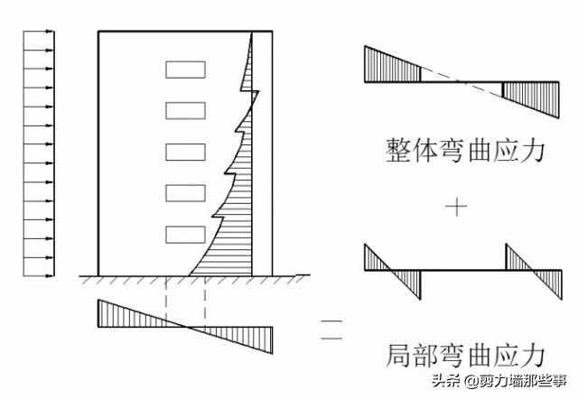 整体小开口墙在水平荷载作用下,截面上的正应力不再符合直线分布,墙肢中存在局部弯矩。整体弯矩在墙肢中产*的弯矩占总弯矩的85%,墙肢的局部弯矩占总弯矩的15%。