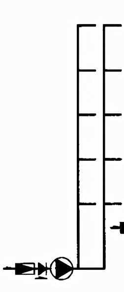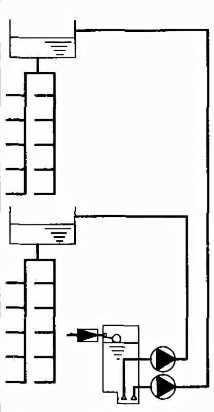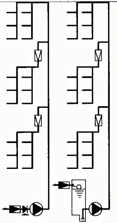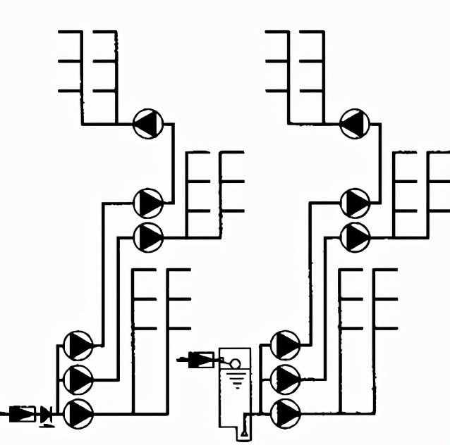 该种供水方式采用分区供水,用泵直接从外网抽水或通过调节池(吸水井)抽水。各区自成系统,每一区的各级提升泵应匹配,并联锁,使用时应先启动下一区泵,才启动上一区泵。各区应配有小气压罐和小流量稳压泵。一般适用于超过100m的高层建筑。楼层中间有设置泵房的可能,并有较强的维护管理能力。