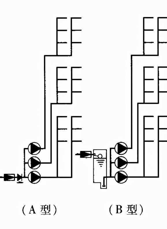 该种供水方式采用分区供水,各区设泵直接从外网抽水(A型)或通过调节池(或吸水井)抽水(B型)升压供水。