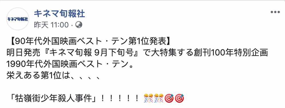 作为创刊100年的特别策划之一,日本著名的电影杂志《电影旬报》今天正式公布1990年十佳外语电影片单(按照惯例,90年代本土十佳片单可能会紧随其后公布。)