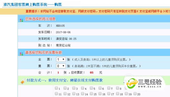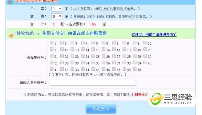 点击“确定”后,会显示出你本次购买的客票的相应的信息,以及你所需要选择的座位号,选择好后,输入自己的相应信息,然后点击下面框框的“在线支付”。