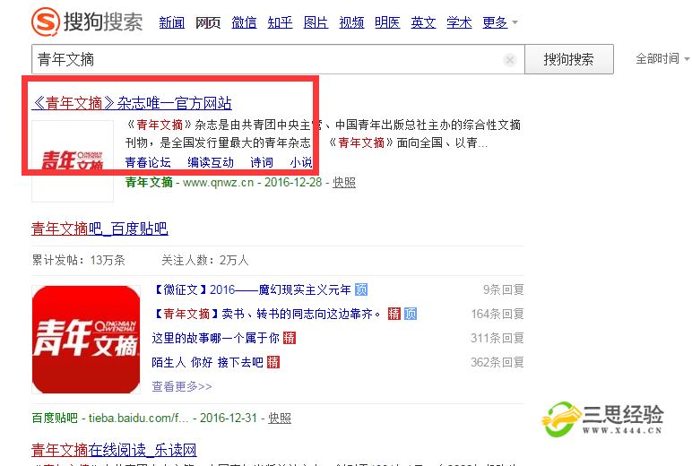 在搜狗搜索搜索“青年文摘”。