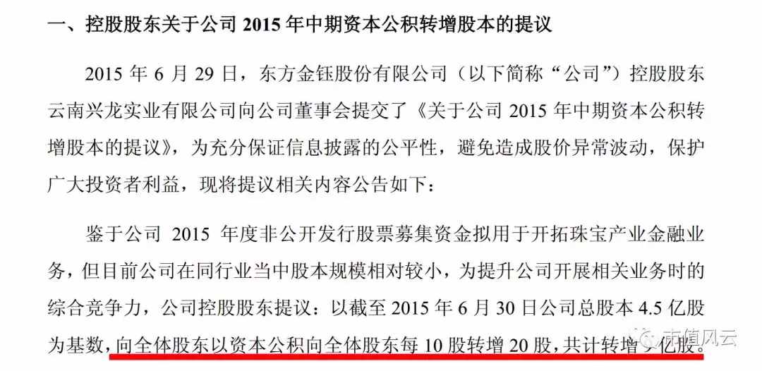 2015年6月30日,东方金钰收到控股股东兴龙实业的《关于公司2015年中期资本公积转增股本的建议》,每10股转增20股。注意一穷二白的东方金钰,高送转的资本公积就是刚刚实施定增而来,不然还真掏不出来。