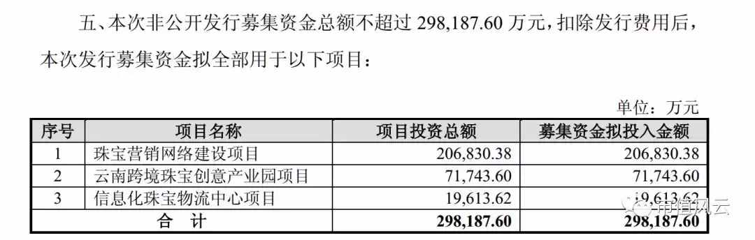 5月13日发布非公开发行预案,拟募集29.88亿元用于珠宝营销网络建设项目、云南跨境珠宝创业产业园项目、信息化珠宝物流中心项目等。对比上面的金额就知道,所谓的先自筹资金支付项目还是借债来的钱,想要定增补回来。