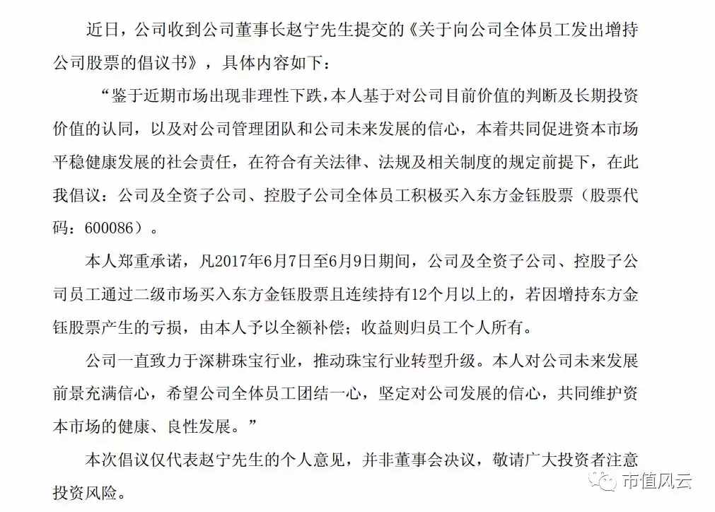 董事长也适时的发布了向公司全体员工发出增持公司股票的倡议书: